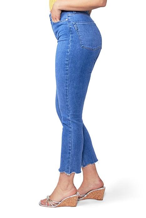 Introducing Flaunt Denim by PAIGE, a denim collection that embraces every curve. This collection was designed in response to the number one most popular request from our customers to update the waist-to-hip ratio on our bestselling fits to embrace the curvier body type of women who are blessed with fuller hips and thighs while maintaining their slim waist. As the experts in fit, we designed every silhouette in this collection to flatter, accentuate and enhance an hourglass figure with a waist-hugging fit. This ultra high rise straight leg is based off of our customer-favorite Cindy Straight, but updated with a waist-to-hip ratio designed for an hourglass shape. Accent is designed with a comfortable top block that accounts for curves as it goes from slim waist to fuller hips and thighs; with specialty back pockets that embrace a wider back that typically distorts pockets; and with a complementing back yoke that flatters and highlights the booty. Cut from our bestselling TRANSCEND Vintage denim in a gorgeous medium wash with natural fading, a ragged frayed hem, and mixed metal hardware, this style has the look of authentic vintage denim but is incredibly comfortable with plenty of stretch and recovery.