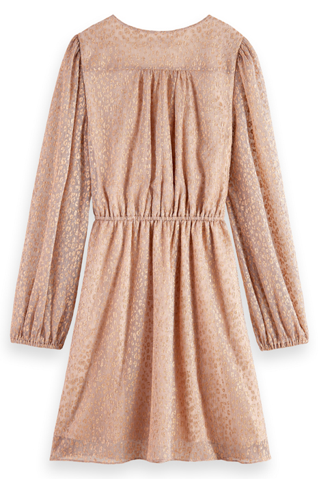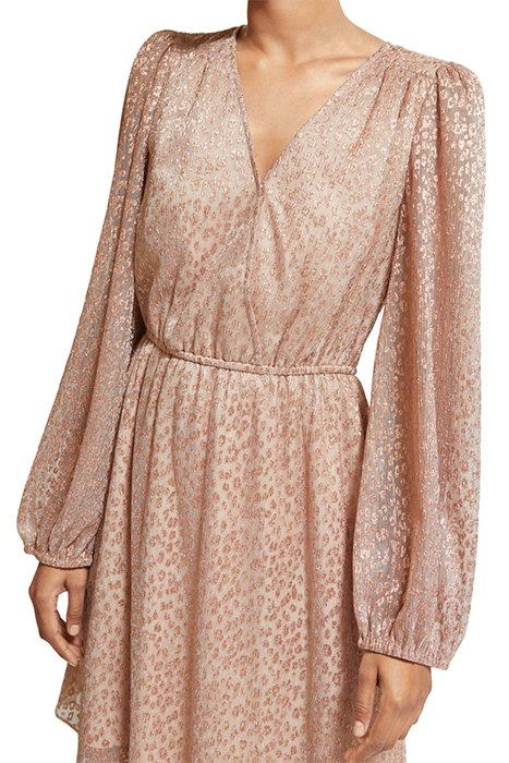 Elevate your evening look with this stunning metallic rose balloon sleeve mini dress by Scotch & Soda. Crafted from a luxurious fabric, this dress features a flattering fit-and-flare silhouette that accentuates your curves. The balloon sleeves add a touch of drama and sophistication to the design, perfect for making a statement at any special occasion. Pair it with strappy heels and statement earrings for a glamorous ensemble that will turn heads wherever you go. Upgrade your wardrobe with this chic and stylish piece from Scotch & Soda.