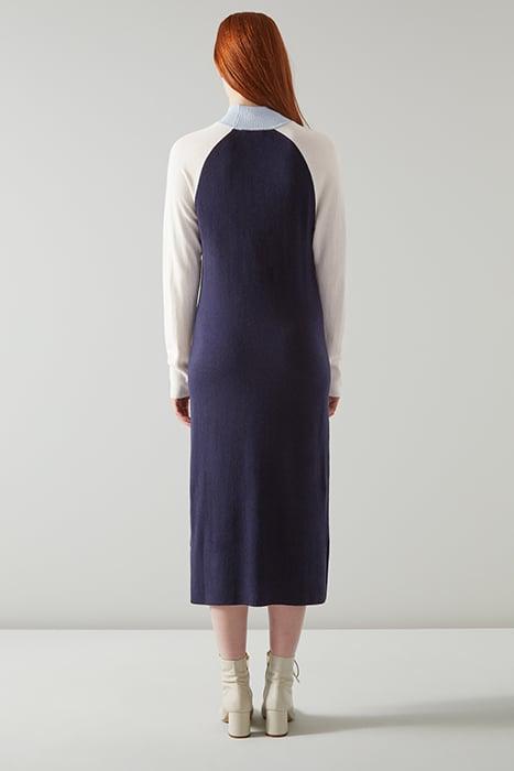 The Bergen jumper dress is crafted from a super-soft merino-blend with a touch of cashmere in colour blocked navy, pale blue and cream. It has a funnel neck, raglan sleeves, ladder stitch detail to the front and a relaxed fit falling to the knee.