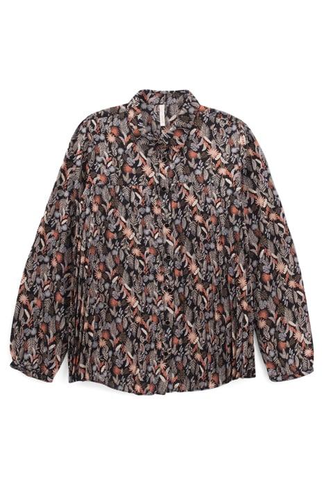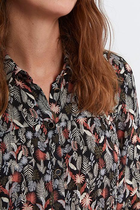 Women’S Black Shirt . Shirt Collar, Long Sleeves . Exclusive Plant Print Designed By I.Code . Chest Seaming Front And Back, Pleats . Decorative Buttons Down Front To Fasten.