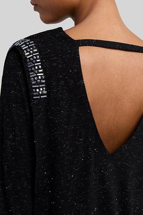 BLACK V NECK VISCOSE T-SHIRT WITH RHINESTONES
