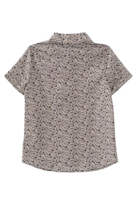 This boys’ shirt has a black graphic leaf print on an ecru background. Wear it open or closed with dark trousers or shorts.