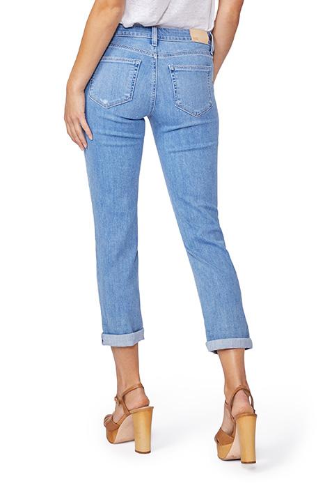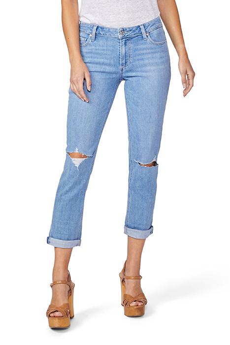 Our mid-rise tailored boyfriend jean is the epitome of cool in a bright medium vintage wash with mixed metal hardware and destruction at both knees. Cut from our famed TRANSCEND Vintage denim, this style has the look of authentic vintage denim but is incredibly comfortable with plenty of stretch and recovery.