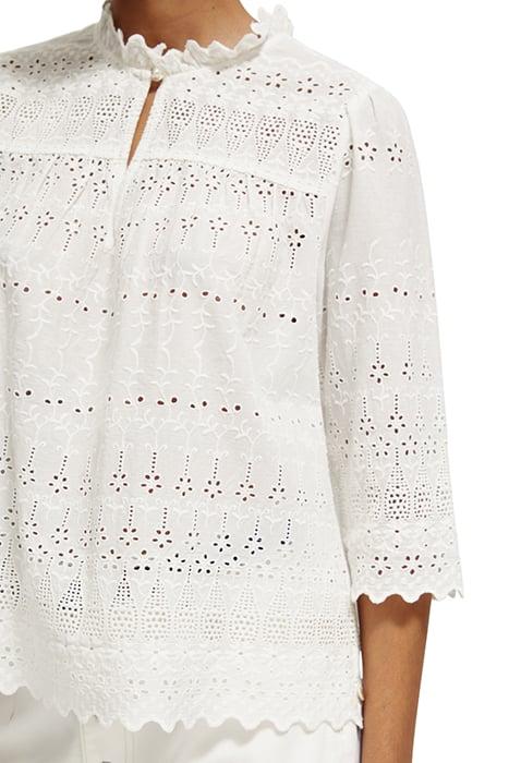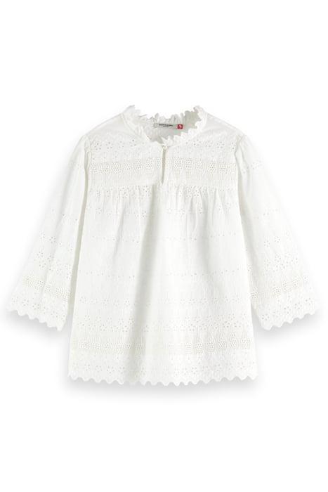 Introducing the Scotch & Soda Broderie Anglaise Top in a timeless off-white hue. This elegant top features intricate broderie anglaise detailing, adding a touch of sophistication to your wardrobe. The lightweight fabric is perfect for warm weather, while the relaxed fit ensures comfort all day long. Whether paired with denim for a casual look or dressed up with tailored trousers for a more polished ensemble, this versatile top is a must-have addition to your collection. Elevate your style effortlessly with the Scotch & Soda Broderie Anglaise Top.
