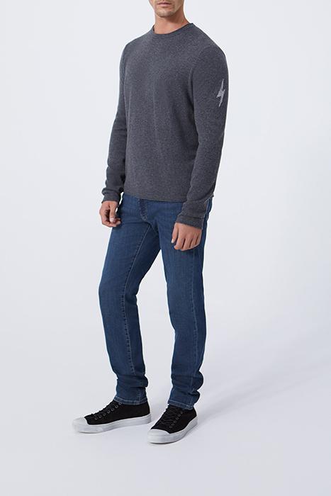 Men’S Charcoal Grey Sweater Round Neck, Long Sleeves Fine Knit, Intarsia Slogan On Back, Visible Seaming Rolled Edges On Neck, Cuffs And Hem