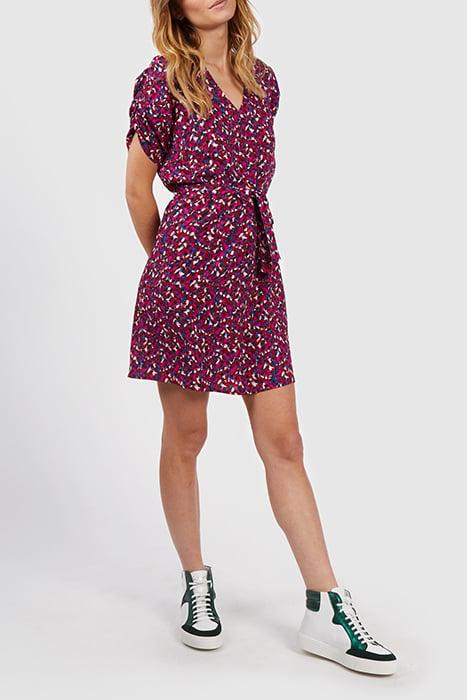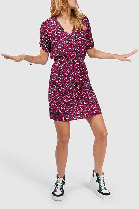 Dark Red Straight Dress V-Neck, Short Gathered Sleeves Tachist Print, Removable Matching Belt Dress Length: 92 Cm