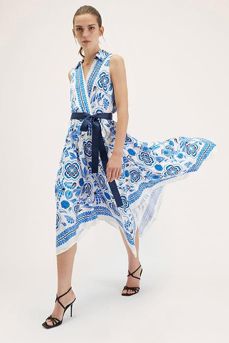 DRESS WITH SCARF PATTERN AND ASYMMETRICAL HEM BLUE