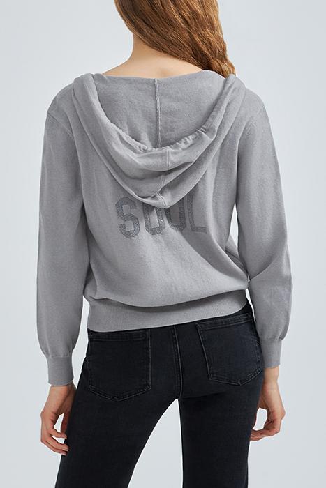 GREY KNIT CARDIGAN, JACQUARD SLOGAN FRONT & BACK