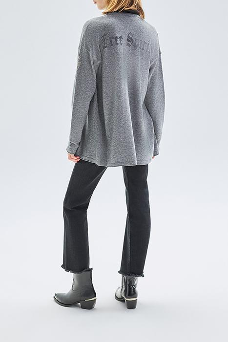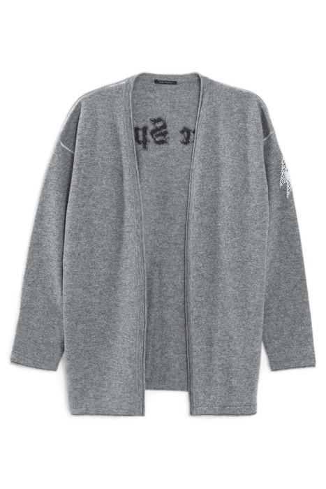 GREY KNIT CARDIGAN WITH SLOGAN ON BACK