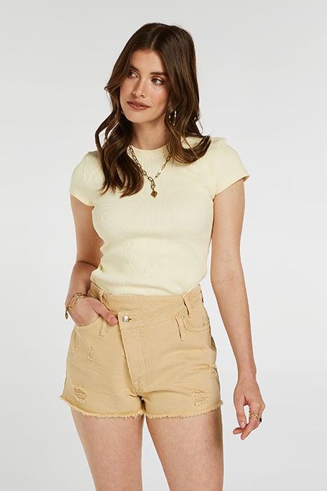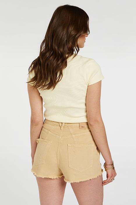The Jv Xara Shorts In The Color Golden Desert Is Made Of A Beautiful Denim Quality. The Nails Falls High Waisted And Has A Loose Fit. The Asymmetrical Button Closure In Combination With The Damaged Details Make These Pants Unique. The Item Is Also Equipped With An Indoor Button, So That It Fits Nicely At The Waist. An Embroidered V-Logo Has Been Processed On The Back Pocket.
