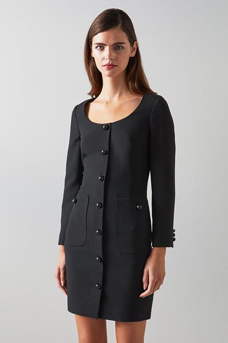 The Keeler dress is crafted in Europe from a black crepe made from a blend of fabrics including recycled polyester. It has a deep scoop neck, long sleeves, fully-functioning black dome buttons, a fitted silhouette and it falls to just above the knee.