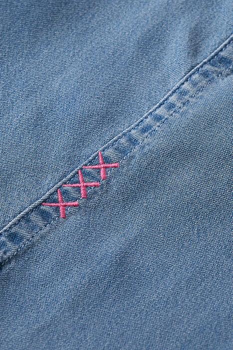 The washed indigo hue adds a cool, laid-back vibe to this classic denim shirt, while the lace-up detail at the neckline adds a trendy twist. Whether you dress it up with tailored pants or keep it casual with jeans, this shirt is perfect for any occasion.
