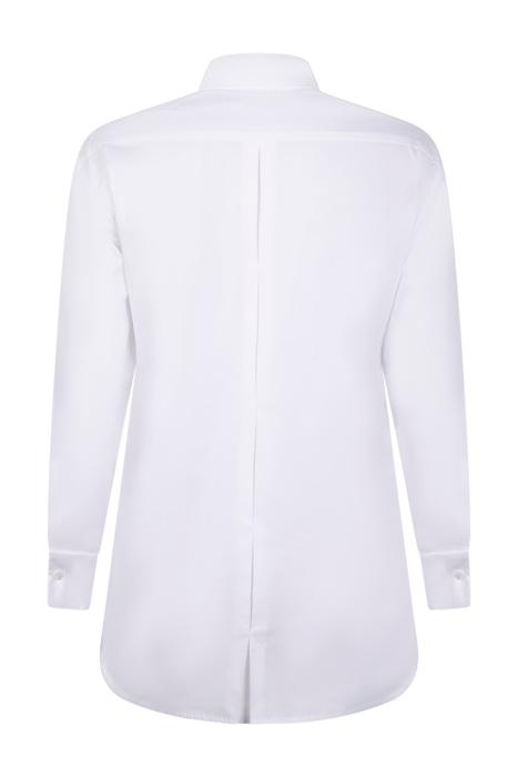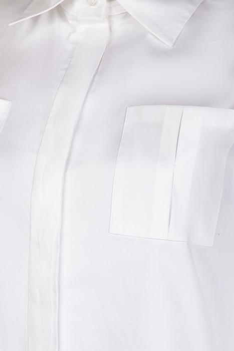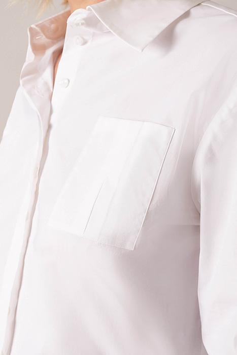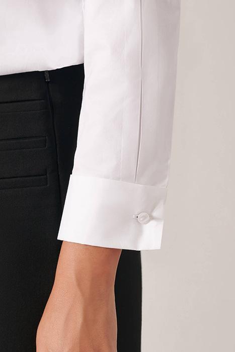 The LIANA is a tunic length white shirt with a classic pointed collar that removes to a mandarin collar. This long sleeve shirt features a shirt tail hem, front patch pocket, a concealed front button placket, and French cuffs that allow for decorative cufflinks. This Poplin loose fit shirt has tacked inverted pleats on the sleeves, patch pockets, and the center back.