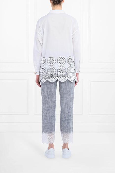 The PAULIN is an off white oversized cotton shirt featuring a classic collar, button tab down the front, small slits on the sides and high-low hem style finished with scalloped edges. The PAULIN is decorated at the bottom with an eyelet floral embroidery. The long sleeves in this shirt are finished with simple cuffs that allow for decorative cufflinks.