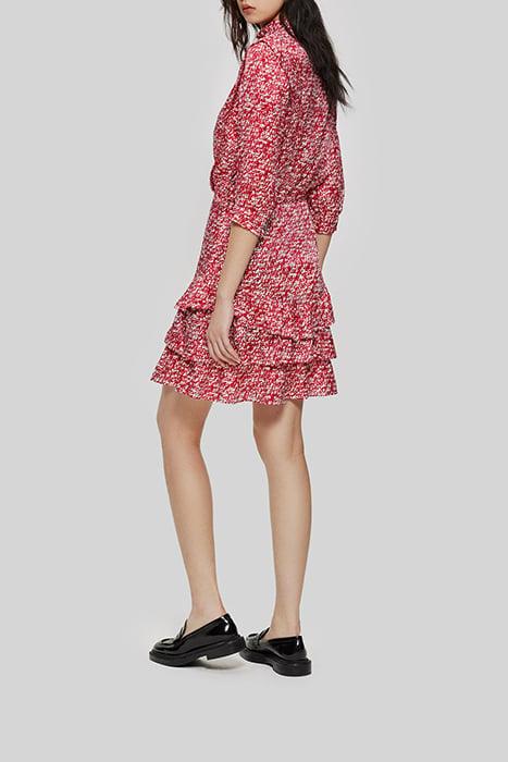 Update Your Classics With A Red And White Satin Dress Which Has A Tag Print And Placed Ruffles For A Modern Edge.