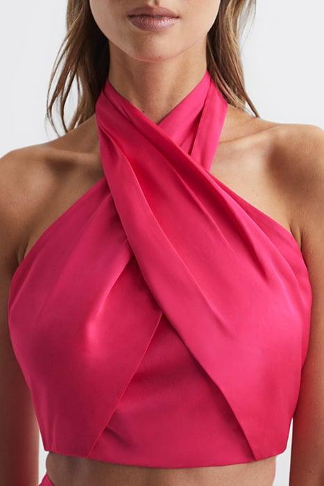 The Pink Ruby Top Is Cropped At The Waist And Features A Cross-Over Halter Design. It Wraps Across The Chest And Ties In A Bow At The Reverse, For An Alluring Open-Back Finish. Style With Heels And The Matching Ruby Maxi-Skirt For An Elegant Occasionwear Edit.