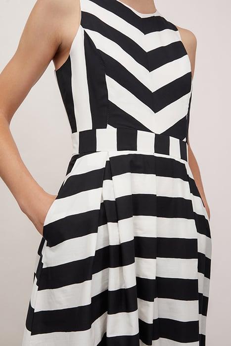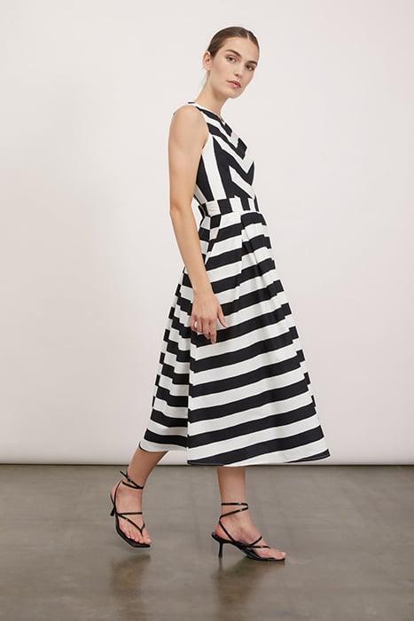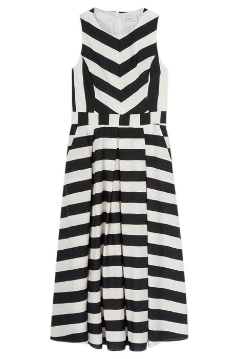Striped Cotton Canvas Midi Dress, Bodice With Round Neckline And Wide Shoulders, Zippered Opening At Centre Back, Flared Skirt With Split Pleats And Side Pockets