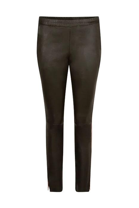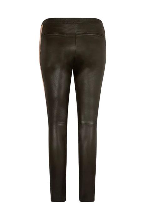 De Tequila is een leren damesbroek met steekzakken en fake paspelzakjes aan de achterzijde. De broek is gemaakt van een stretchleer kwaliteit en heeft een elastische band, wat zorgt voor een fijne pasvorm. De contrasterende bies langs de zijkant maakt de broek wat sportiever., NAPPA STRETCH