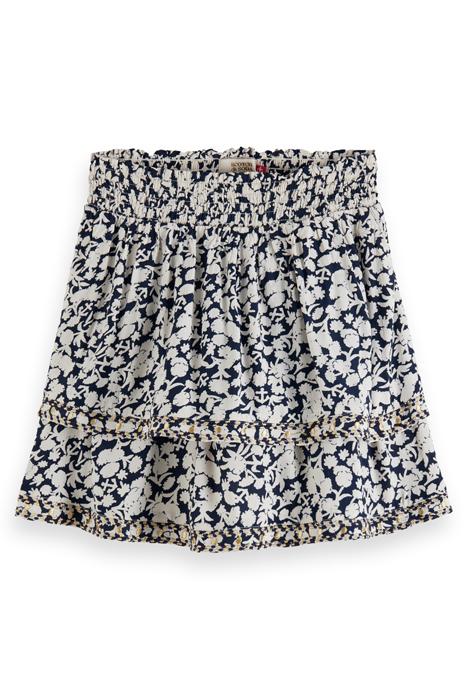 TIERED ALL-OVER PRINTED EMBROIDERED VISCOSE MINI SKIRT ANCHO