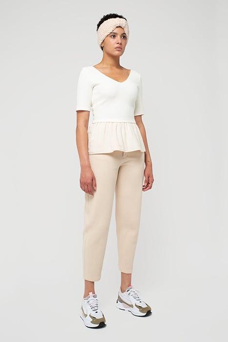 In this contrast top, Struc is combined with a viscose lapel. Because the viscose lap has filling, the fabric gets volume. The top fits snugly with the lap being wider. The open neck and back make the top feminine. Our heritage fabric called 'Struc' has a luxurious structure with an ultimately comfortable wearing experience. It has been a common thread through our collection for years. Struc is a mix of responsibly sourced cotton, polyamide and elastane and comes from Turkey. With functionality in mind, this fabric has been developed in such a way that it remains beautiful for years and is easy to wash. In addition, the Chinese Viscose used in the lap is extremely soft and light on the skin. The model is 1.77 m and wears size 36.