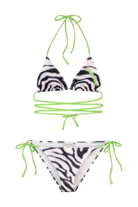 A bikini which will take you from beach to bar and back again. The string design features multiple straps that will add definition at the waist and fully adjustable tie fastenings so you can choose the level of support. Inspired by the plains of Africa, the zebra print is complemented by a neon green trim. Pair with matching Renini Top to complete the set